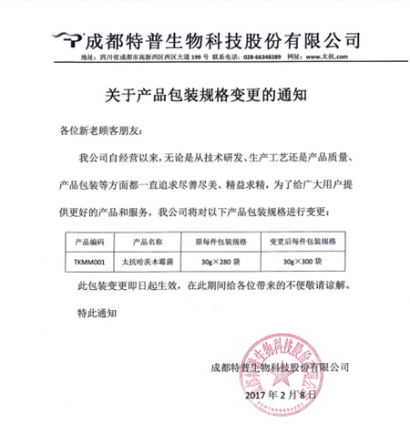 本著精益求精的工匠精神,以提高客戶滿意度為宗旨,同時根據(jù)市場需求、客戶反饋以及公司的發(fā)展需求,2月8日,公司給市場上各位新老客戶發(fā)出了關于太抗?哈茨木霉菌包裝變更的通知,公司生產部的同事們也正加班加點生產,希望趕在春播前把產品配送到各位客戶朋友手上!