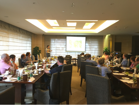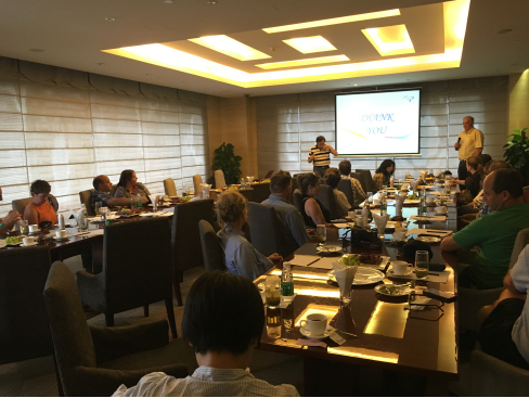 會上,董事長黃永博士詳細(xì)講解了太抗系列產(chǎn)品的作用機理及各地應(yīng)用案列,得到了所有與會人員的高度關(guān)注。當(dāng)講到太抗產(chǎn)品的安全性時,外賓們紛紛將在燒杯中的樣品看了又看,聞了又聞,可能實在覺得看似酸奶的生物農(nóng)藥著實稀奇。PPT放映結(jié)束后,外賓們接連提問,關(guān)于產(chǎn)品的保質(zhì)期、使用技術(shù)、投入產(chǎn)出比等等,董事長一一解答,連喝水的空都沒有。其中,來自來自維多利亞州的Gary Jeans講到其種植有4000公頃有機李用于出口中國,非常希望能用上太抗系列產(chǎn)品!此外,有外賓提出想帶些樣品回澳洲,也有外賓提出想和我公司澳洲研發(fā)人員深入交流,更有外賓要了黃董厚厚一疊名片說是要去澳洲幫我們做宣傳!