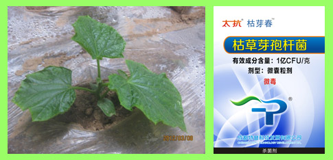 黃瓜的根系分布較淺,吸收能力相對較差,而黃瓜對氮、磷、鉀等營養(yǎng)元素需求量大,吸收速率快,因此苗期養(yǎng)好植株根系是黃瓜高產(chǎn)栽培的基礎(chǔ),苗期用枯芽春TM對植株進(jìn)行灌根,在根系周圍形成枯草芽孢桿菌保護(hù)層,不僅能促進(jìn)根系生長,亦能防治黃瓜后期枯萎病的發(fā)生。